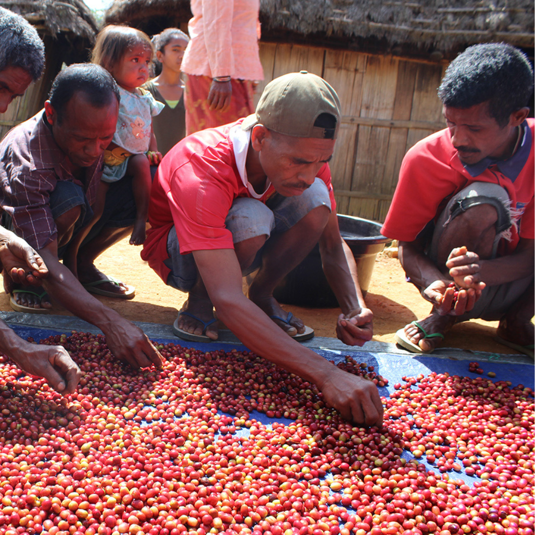 Our Timor coffee is wild-grown by 386 farming families in the mountains of Timor-Leste. Coffee cherries are picked by hand, then wet-processed and sun-dried right in the communities where they’re grown. The beans are then hand-sorted in Dili before being bagged up and shipped to our Melbourne coffee roastery.