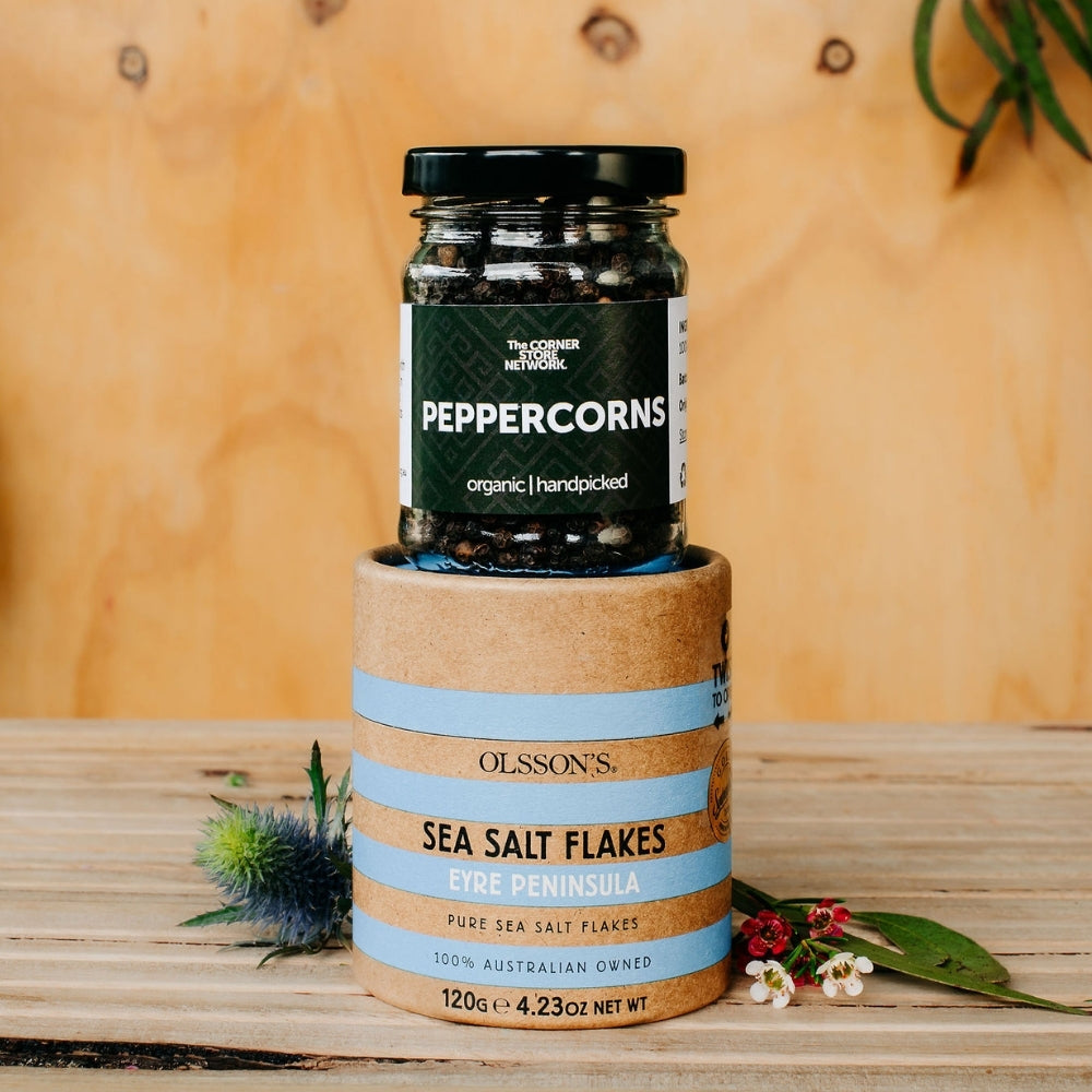 • 75 g jar of Black Peppercorns: Grown and processed in the regions where our coffee is grown, our black peppercorns are full of flavour, organic and provide diversified income streams for coffee farming communities in Ermera, Timor-Leste
